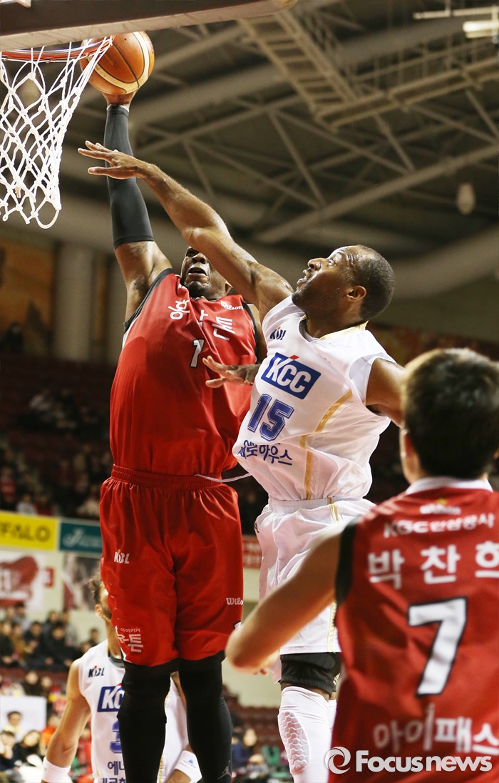 (안양=포커스뉴스) 13일 안양실내체육관에서 열린 2015-2016 프로농구 KGC-KCC 경기에서 KGC 찰스 로드가 KCC 허버트 힐의 수비를 뿌리치며 원핸드 덩크슛을 시도하고 있다.