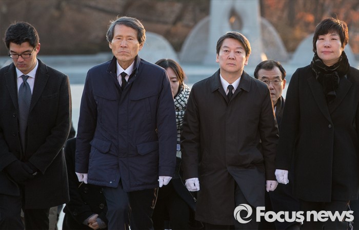 (서울=포커스뉴스) 14일 오전 서울 강북구 국립 4.19 민주묘지를 찾은 한상진(왼쪽 두번째 부터) 국민의당 창당준비위원장과 안철수 인재영입위원장이 분향단으로 발걸음을 옮기고 있다.
