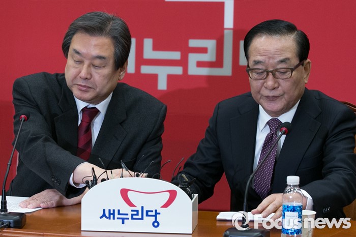 (서울=포커스뉴스) 김무성(왼쪽) 새누리당 대표가 14일 오전 서울 여의도 국회에서 열린 최고위원회의에 참석해 서청원 최고위원에게 마이크를 넘기고 있다.