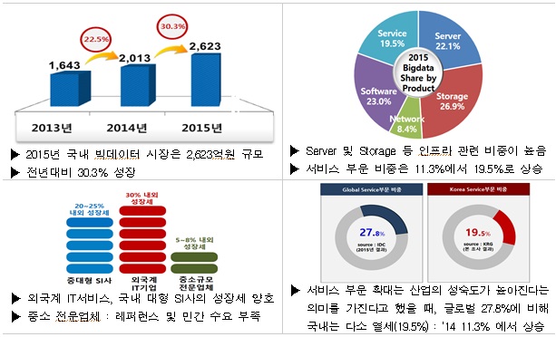 국내 시장 규모가 성장한 것은 민․관의 적극적 투자 덕분이었다. 빅데이터 관련 정부투자는 2014년 490억원에서 지난해 698억원으로 확대돼 42.4%로 성장했으며 민간투자는 1925억원으로 26.4%로 성장하는 등 전반적으로 빅데이터 투자가 확대됐다.