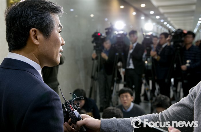(서울=포커스뉴스) 김승남 더불어민주당 의원이 14일 오전 서울 여의도 국회 정론관에서 탈당 기자회견을 마친 뒤 취재진 질문에 답하고 있다.