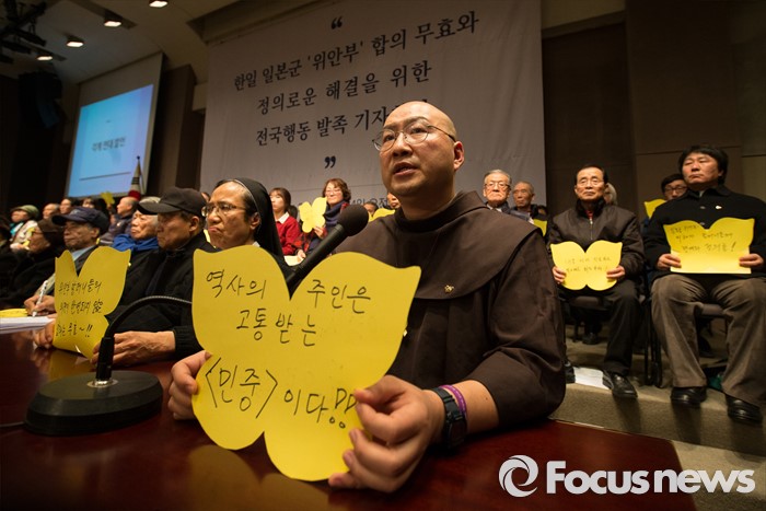 (서울=포커스뉴스) 한국정신대문제대책협의회와 시민단체가 14일 오후 서울 중구 프레스센터에서 시민사회단체와 학생, 예술 단체 등 사회각계각층이 참여하는 '한일 일본군 위안부 합의 무효와 정의로운 해결을 위한 전국행동' 발족 기자회견을 열고 있다.