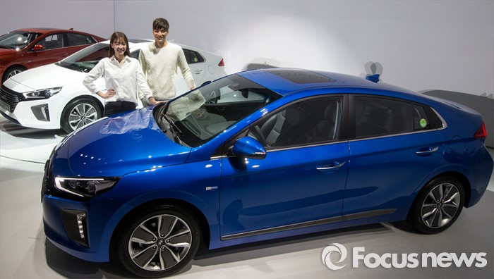 (서울=포커스뉴스) 14일 오전 서울 중구 동대문디자인플라자에서 모델들이 하이브리드 자동차 '아이오닉'을 선보이고 있다.