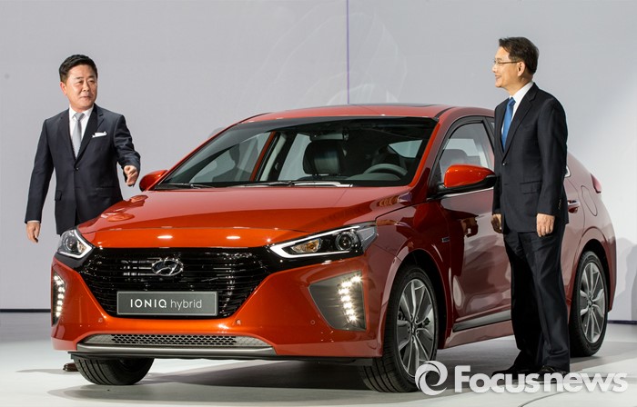 (서울=포커스뉴스) 14일 오전 서울 중구 동대문디자인플라자에서 권문식(오른쪽) 현대자동차 부회장과 곽진 부사장이 하이브리드 자동차 '아이오닉'을 선보이고 있다.