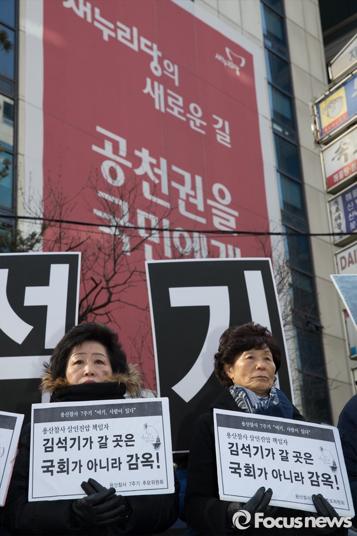 (서울=포커스뉴스) 용산참사 진상규명위원회 및 유가족들이 14일 오후 서울 영등포구 여의도 새누리당사앞에서 열린 새누리당 총선 예비후보(경주), 용산참사 책임자 김석기 규탄 기자회견을 열고 있다.