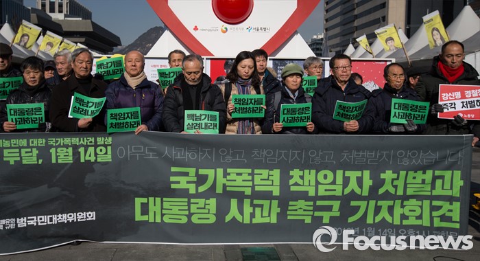 (서울=포커스뉴스) 14일 오후 서울 중구 광화문 광장에서 '백남기 농민 쾌유와 국가폭력규탄 범국민대책위원회' 관계자들이 지난해 서울 도심 집회에서 백남기씨가 경찰의 직사 물대포에 맞고 쓰러진 것과 관련해 책임자 처벌과 대통령 사과를 촉구하고 있다.