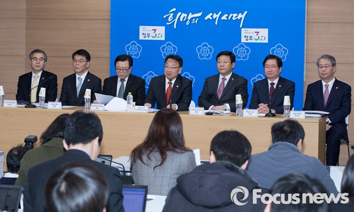 왼쪽부터 정재찬 공정거래위원장, 강호인 국토교통부장관, 이동필 농림축산식품부장관, 유일호 부총리, 주형환 산업통상자원부장관, 김영석 해양수산부장관, 임종룡 금융위원장.