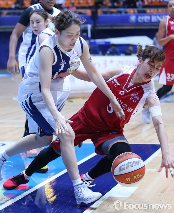 (인천=포커스뉴스) 14일 인천도원체육관에서 열린 2015~2016 여자프로농구 신한은행-KDB생명 경기에서 KDB생명 이경은이 신한은행 윤미지와 바운드돤 볼을 다투다 넘어지고 있다.