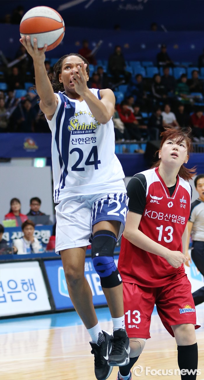 (인천=포커스뉴스) 14일 인천도원체육관에서 열린 2015~2016 여자프로농구 신한은행-KDB생명 경기에서 신한은행 모니크 커리가 KDB생명 김소담을 제치고 레이업슛을 시도하고 있다.