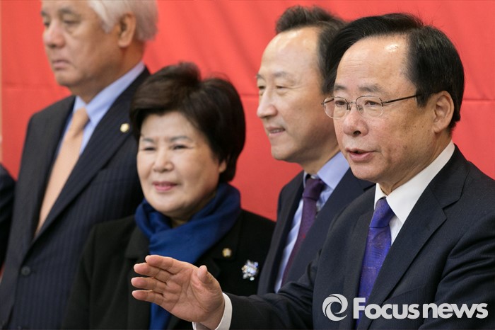 (서울=포커스뉴스) 이주영(오른쪽) 새누리당 저출산대책특위 위원장이 15일 오전 서울 여의도 국회 귀빈식당에서 열린 사교육비 절감방안 논의를 위한 당정협의에 참석해, 기념촬영 중 인사말을 하고 있다.