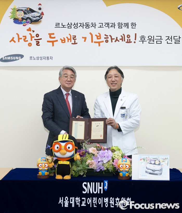 (서울=포커스뉴스) 르노삼성자동차는 지난 14일 서울 연건동 서울대학교병원 어린이병원을 찾아 작년 12월 진행한 ‘연말 1+1 기부행사’의 총 모금액 약 3250만원을 전달했다고 15일 밝혔다.
