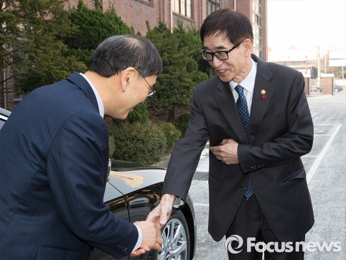 (세종=포커스뉴스) 이준식 사회부총리 겸 교육부장관이 15일 오전 세종시 조치원여자중학교에서 열린 자유학기제 현장간담회에 참석해 구자일 교장과 인사를 하고 있다.
