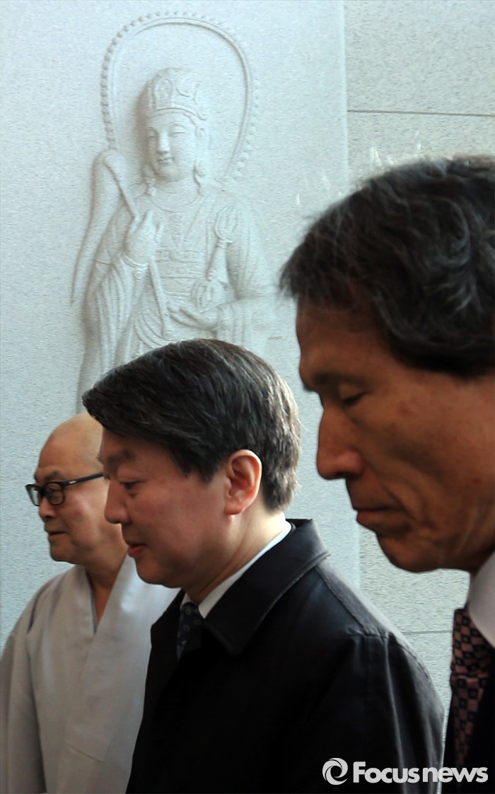 (서울=포커스뉴스) 불교계 방문한 안철수 의원 무소속 안철수 의원(가운데)이 15일 오전 서울 종로구 견지동 조계사 한국불교역사문화기념관에 도착해 조계종 총무원 사서실장 심경스님, 한상진 국민의당 창당준비위원장과 함께 건물로 들어가고 있다.