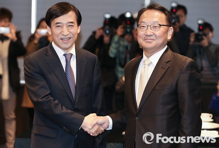 (서울=포커스뉴스) 15일 오후 서울 중구 은행회관에서 유일호(오른쪽) 경제부총리와 이주열 한국은행 총재가 오찬 회동에 앞서 악수를 하고 있다.