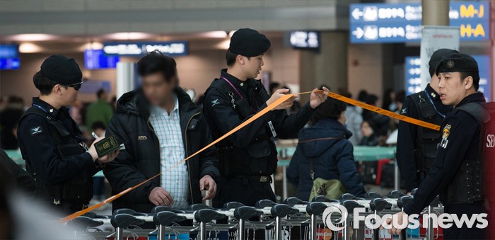 (인천공항=포커스뉴스) 한국공항공사 콜센터로 '전국공항'에 폭발물을 설치 했다는 협박 전화가 걸려온 15일 오후 인천국제공항 출국장에서 공항경찰대원들이 검문검색을 하고 있다.