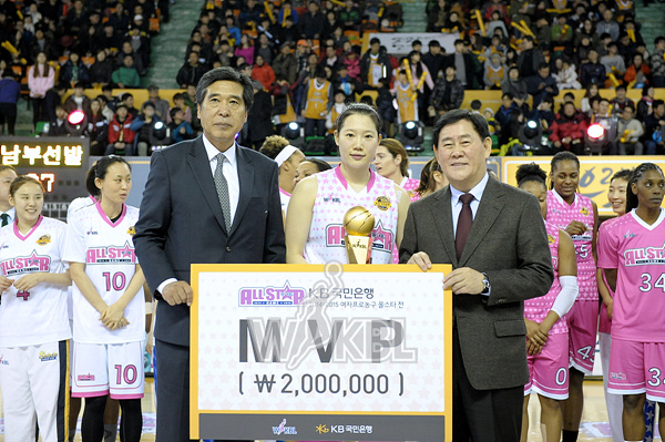 중계방송은 KBSN스포츠에서 17일 오후 12시50분부터 시작한다. 올 시즌 부상으로 코트를 밟지 못한 부천 KEB하나은행 선수 신지현이 해설위원으로 깜짝 변신하는 점도 볼거리다. 신지현은 재치 있는 입담으로 올스타전 경기를 팬들에게 생생하게 전달할 계획이다.2015년 1월18일 충북 청주 청주체육관에서 열린 2014~2015 KB국민은행 여자프로농구 올스타전에서 MVP선정된 강아정이 포즈를 취하고 있다. <사진제공=여자프로농구연맹(WKBL)>
