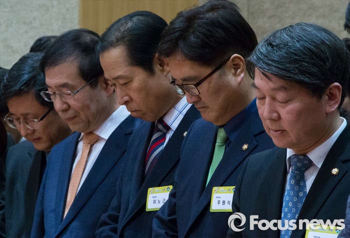 (서울=포커스뉴스) 15일 오후 서울 노원구청 대강당에서 열린 2016 노원구 신년인사회에 참석한 김성환(맨 왼쪽부터) 노원구청장과 박원순 서울시장, 이노근 새누리당 의원, 우원식 더불어민주당 의원, 안철수 국민의당 인재영입위원장이 묵념하고 있다.
