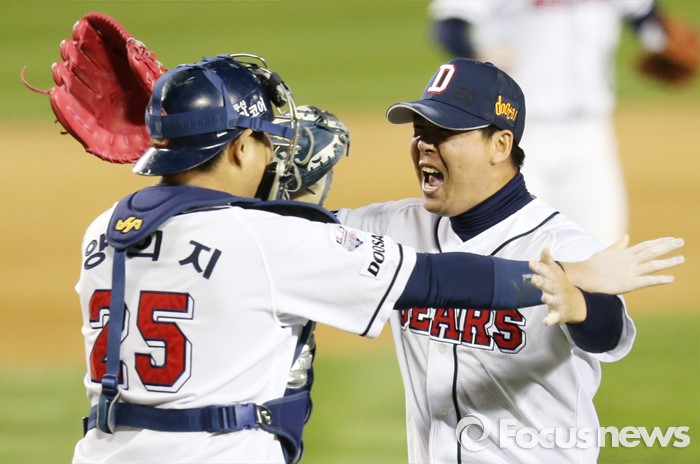 마무리 이현승도 1억5500만원에서 4억원으로 훌쩍 뛰었다. 이현승도 포스트시즌 뿐 아니라 프리미어12에서도 뒷문을 지켜냈다. 포스트시즌 부진했으나 정규시즌 18승을 거두며 에이스로 활약한 유희관은 2억원에서 4억원으로 인상됐다.<서울=포커스뉴스> 두산 포수 양의지(왼쪽)와 마무리투수 이현승이 한국시리즈 우승 프리미엄을 받으며 연봉이 대폭 인상됐다. 양의지와 이현승이 지난해 10월30일 한국시리즈 4차전 승리 뒤 기쁨을 나누고 있는 모습. 우정식 기자