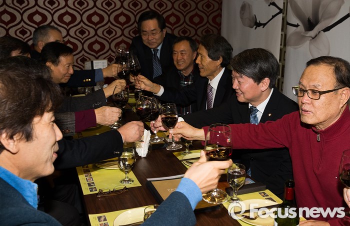 (서울=포커스뉴스) 한상진 국민의당 창당준비위원장과 안철수 인재영입위원장이 15일 오후 서울 관악구 한 태국 식당에서 진행된 故 김대중 전 대통령 재임 당시 자문정책기획위원회 모임에 참석해 위원들과 건배하고 있다.