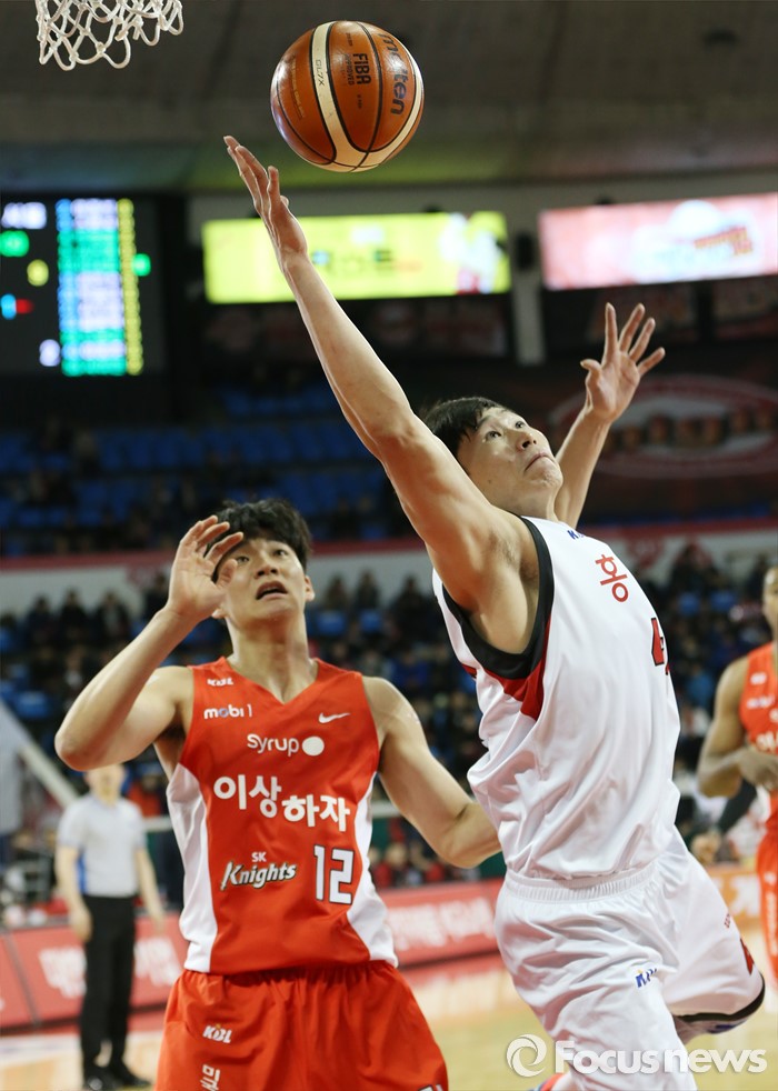 (서울=포커스뉴스) 15일 서울 잠실학생체육관에서 열린 2015-2016 프로농구 SK-KGC 경기에서 KGC 오세근이 SK 이대헌에 앞서 리바운드볼을 잡고 있다.