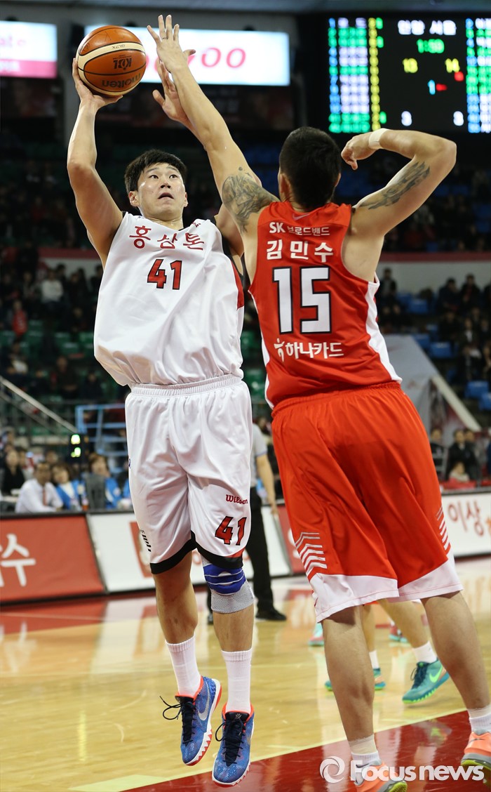 (서울=포커스뉴스) 15일 서울 잠실학생체육관에서 열린 2015-2016 프로농구 SK-KGC 경기에서 KGC 오세근이 SK 김민수의 받으며 점프슛을 하고 있다.