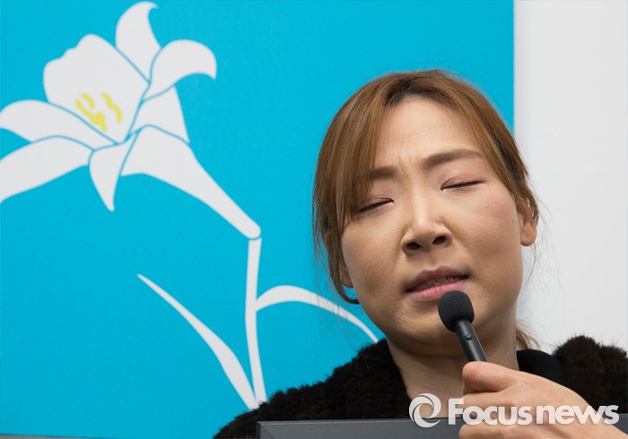 (서울=포커스뉴스) 16일 오후 서울 서대문구 군피해치유센터 '함께' 개소식에서 故 신성민 상병 둘째누나 신미희 씨가 인사말을 하고 있다.