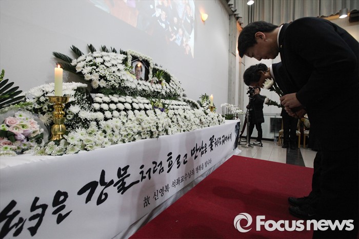 (서울=포커스뉴스) 한상진 국민의당 창당준비위원장과 안철수 인재영입위원장이 16일 오후 서울 구로구 성공회대학교 성미가엘성당에 마련된 故 신영복 성공회대 석좌교수의 빈소를 찾아 헌화하고 있다. <사진제공=성공회대학교>