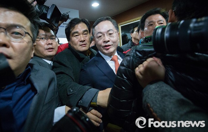 (서울=포커스뉴스) 안대희 전 대법관이 17일 서울 여의도 새누리당사에서 열린 기자회견에서 제 20대 총선 마포갑 출마를 공식 선언 했다. 안대희 전 대법관이 강승규 마포갑 당협위원장 지지자들의 항의 속에 자리를 빠져나오고 있다.