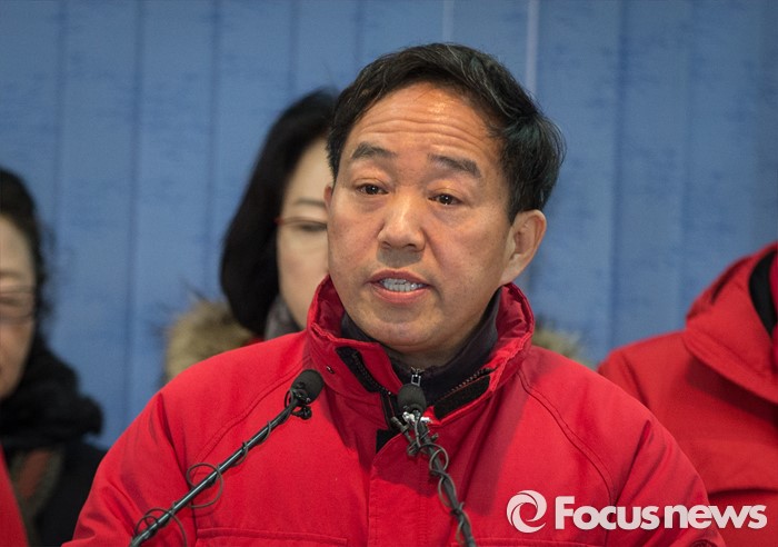 (서울=포커스뉴스) 안대희 전 대법관이 서울 마포(갑) 출마 선언을 한 17일 오전, 서울 여의도구 새누리당 당사에서 강승규 새누리당 마포갑 당협위원장이 안 전 대법관을 지탄하는 기자회견을 하고 있다.