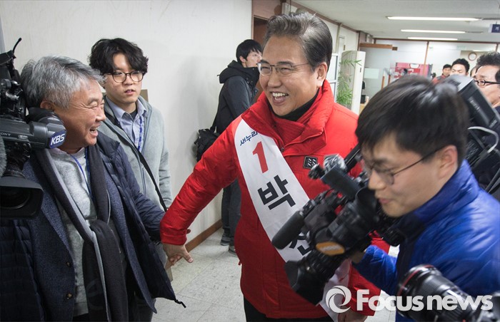 (서울=포커스뉴스) 서울 종로 새누리당 예비 후보인 박진 전 의원이 17일 오후 서울 여의도 새누리당사에서 오세훈 전 서울시장의 종로 출마선언에 대한 입장을 밝히기 위해 기자회견장을 들어서며 기자들과 악수를 나누고 있다.