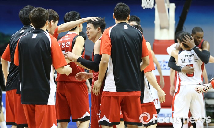 (안양=포커스뉴스) 17일 안양실내체육관에서 열린 2015-2016 프로농구 KGC-모비스 경기에서 연장전끝에 모비스를 물리친 KGC 선수들이 이정현의 머리를 쓰다듬고 있다.