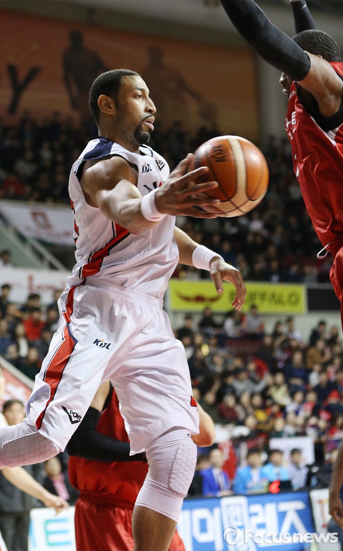 (안양=포커스뉴스) 17일 안양실내체육관에서 열린 2015-2016 프로농구 KGC-모비스 경기에서 모비스 클라크가 골밑에서 KGC 찰스 로드의 수비에 막히자 패스를 시도하고 있다.