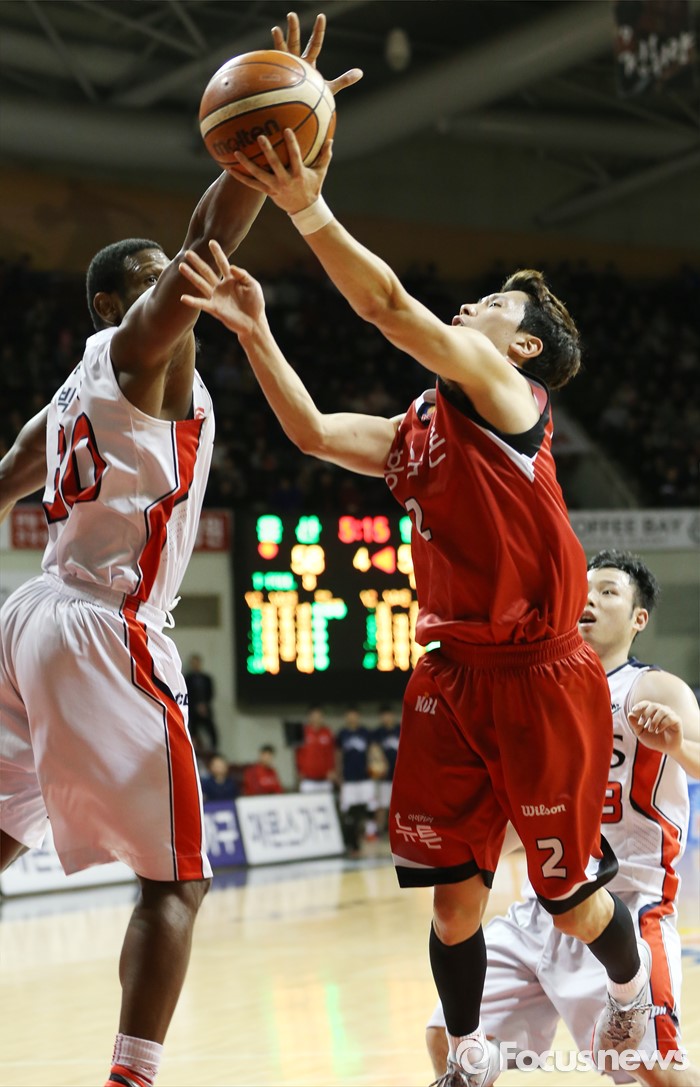 (안양=포커스뉴스) 17일 안양실내체육관에서 열린 2015-2016 프로농구 KGC-모비스 경기에서 KGC 김기윤이 모비스 빅터의 슛블록 피하며 레이업슛을 시도하고 있다.