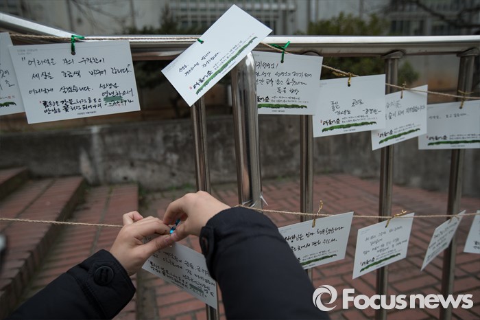 (서울=포커스뉴스) 17일 오후 서울 구로구 성공회대학교 대학성당에 차려진 故 신영복 성공회대 석좌교수의 빈소 주위에 한 소년이 신영복 교수를 추모하는 엽서를 붙이고 있다.