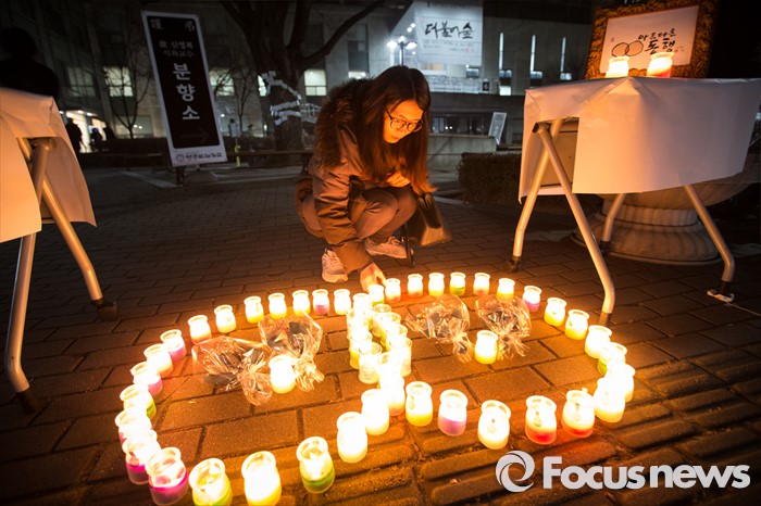 (서울=포커스뉴스) 17일 밤 서울 구로구 성공회대학교 대학성당 앞에 마련된 故 신영복 석좌교수의 빈소를 찾은 한 조문객이 빈소 앞에 명복을 기원하는 촛불을 밝히고 있다.