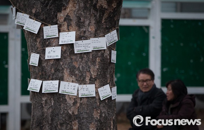 (서울=포커스뉴스) 17일 오후 서울 구로구 성공회대학교 대학성당에 차려진 故 신영복 성공회대 석좌교수의 빈소 앞 나무에 신영복 교수를 추모하는 엽서가 붙어 있다.