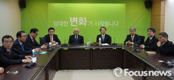 (서울=포커스뉴스) 18일 오전 서울 마포구 국민의당 당사에서 열린 기조회의에 참석한 의원들이 비공개 회의를 하기 위해 기다리고 있다. (오른쪽 두번째부터) 안철수 인재영입위원장, 김동철 부위원장, 한상진 창당준비위원장, 김한길 상임부위원장, 김영환 전략위원장.