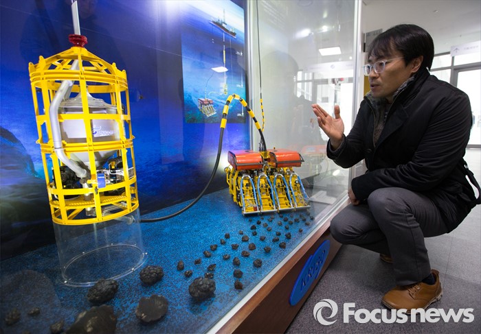 (세종=포커스뉴스) 여태경 해양플랜트산업기술센터 책임연구원이 18일 오전 세종시 정부세종청사 해수부 기자실에서 브리핑을 열고 심해저에서 채집된 망간단괴를 파이프를 이용해 수면 위 채광선으로 이송하기 위한 시스템(양광시스템)을 개발, 해상 실증시험에 사용된 심해저 망간단괴 통합채광 시스템에 대한 설명을 하고 있다.