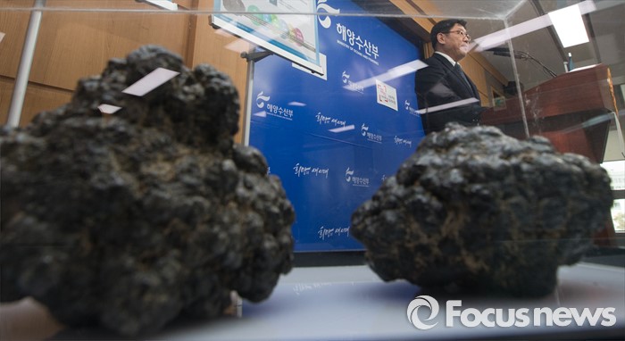 (세종=포커스뉴스) 지상범 한국해양과학기술원 해저환경·자원 연구본부장이 18일 오전 세종시 정부세종청사 해수부 기자실에서 브리핑을 열고 심해저에서 채집된 망간단괴를 파이프를 이용해 수면 위 채광선으로 이송하기 위한 시스템(양광시스템)을 개발, 해상 실증시험에 대한 설명을 하고 있다.