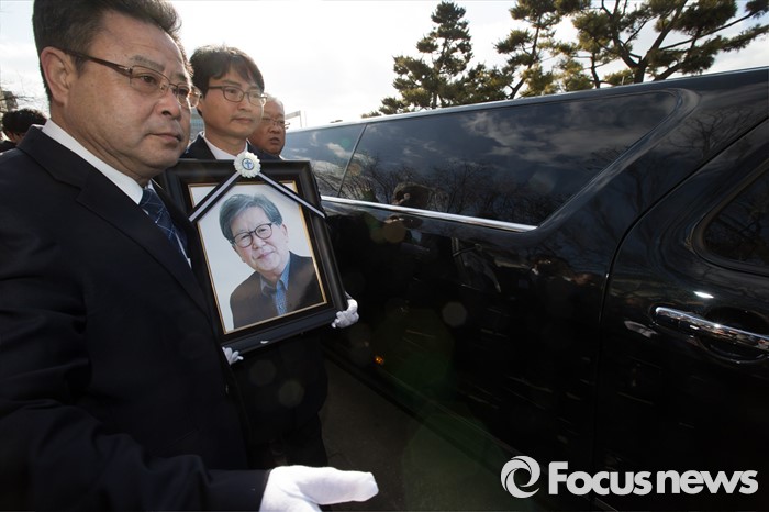 (서울=포커스뉴스) 18일 오후 서울 구로구 성공회대학교 대학성당에서 故 신영복 석좌교수 영결식이 끝나고 고인의 영정과 유해가 운구되고 있다.