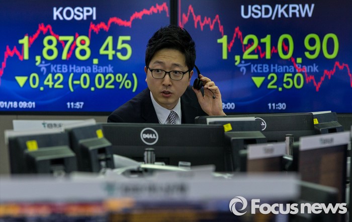 (서울=포커스뉴스) 코스피 지수가 중국 경제에 대한 불안감과 국제유가 하락 등의 여파로 전 거래일 대비 0.42포인트(0.02%) 하락한 1878.45로 마감한 18일 오후 서울 중구 KEB하나은행 딜링룸에서 딜러들이 업무를 보고 있다. 이날 원달러 환율은 전 거래일보다 1.5원 하락한 1,210.9원, 원위안 환율은 전거래일보다 0.63원 오른 183.93원에 장을 마쳤다.