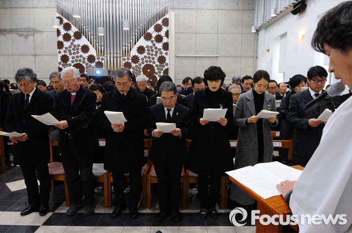 (서울=포커스뉴스) 18일 오후 서울 구로구 성공회대학교 대학성당에서 열린 故 신영복 석좌교수 영결식에서 문재인(왼쪽 세번째) 더불어민두장 대표와 이재정 경기도교육감 등 참석자들이 고별 예식을 하고 있다. <사진제공=성공회대>