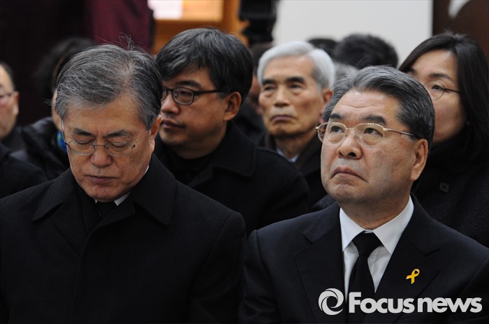 (서울=포커스뉴스) 18일 오후 서울 구로구 성공회대학교 대학성당에서 열린 故 신영복 석좌교수 영결식에서 문재인(왼쪽) 더불어민두장 대표와 이재정 경기도교육감이 참석하고 있다. <사진제공=성공회대>