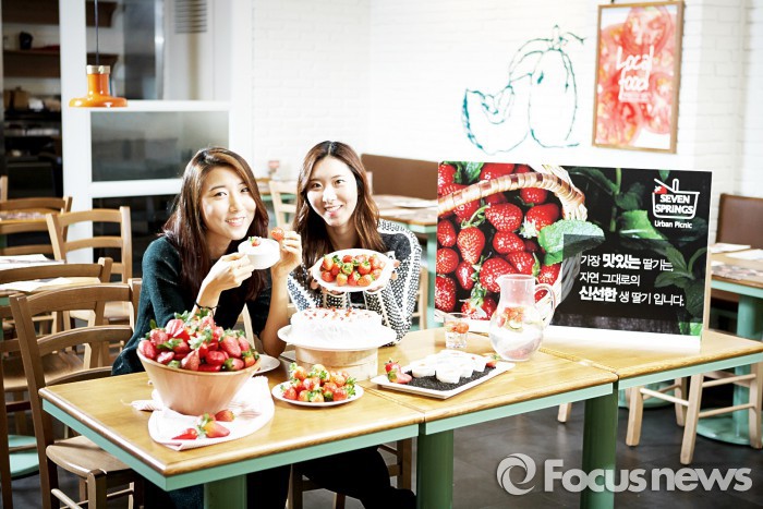 세븐스프링스 관계자는 "자사는 최상품의 딸기를 안정적으로 확보하기 위해 지난해부터 딸기 농가와 전략적 제휴를 맺은 바 있다"고 말했다.세븐스프링스가 출시한 생딸기 신메뉴를 모델들이 선보이고 있다. <사진제공=삼양그룹>