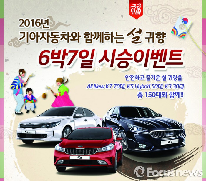 (서울=포커스뉴스) 기아자동차는 설 연휴를 맞아 총 150대의 귀향 차량을 무상 대여해주는 6박7일 시승 이벤트를 진행한다고 19일 밝혔다.