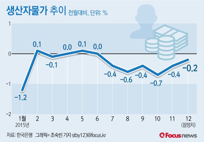 (서울=포커스뉴스) 19일 한국은행은 2015년 12월 생산자물가지수(2010년 100을 기준)가 99.06으로 전월(99.25)보다 0.2% 하락했다고 밝혔다.