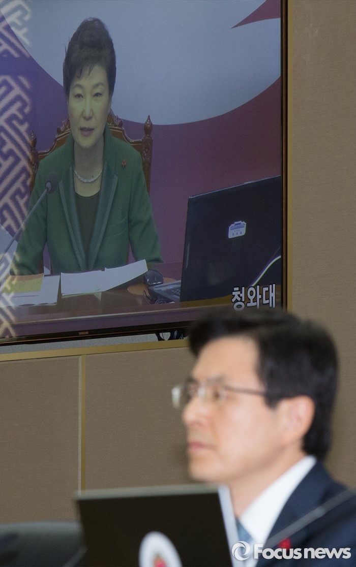 (세종=포커스뉴스) 황교안 국무총리가 19일 오전 세종시 정부세종청사 국무회의장에서 열린 청와대-세종청사 영상 국무회의에 참석해 박근혜 대통령의 모두발언을 경청하고 있다.