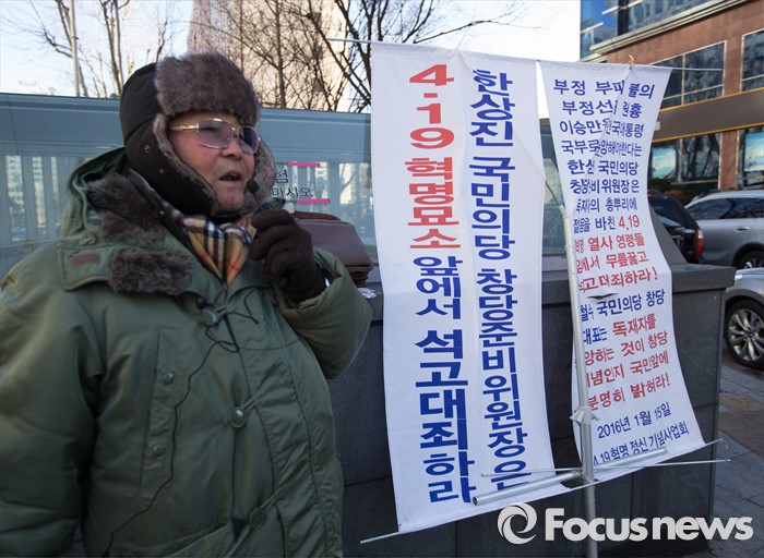 (서울=포커스뉴스) 19일 서울 마포구 일신빌딩 국민의당 당사 앞에서 419혁명정신기념사업회 관계자가 한상진 국민의당 창당준비위원장의 사과를 촉구하며 1인 시위를 하고 있다.