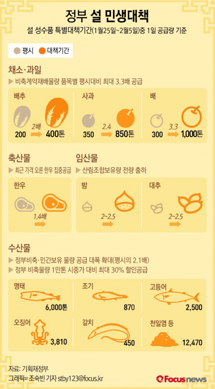 (서울=포커스뉴스) 기획재정부는 물가안정을 위해 설 성수품 공급을 평상시보다 3.3배나 늘려 공급키로 했고 유가하락 요인을 반영해 도시가스 등 공공요금에 적기에 반영키로 했다.