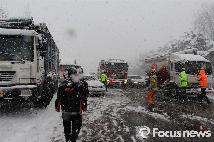 (서울=포커스뉴스) 19일 오후 12시 48분께 전북 정읍시 북면 남산리 호남고속도로 내장산IC와 태인IC 사이에서 차량 30여대가 추돌하는 사고가 발생해 경찰, 소방관, 도로공사 직원들이 사고 수습작업을 하고 있다.